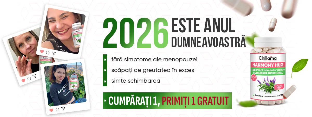 HarmonyHug este un supliment alimentar 100% natural pentru sănătatea femeilor - acesta ameliorează și reglează simptomele menopauzei (bufeuri de căldură, tulburări de dispoziție și somn, creșterea în greutate, probleme digestive și dureri musculare) și ale sindromului premenstrual (cicluri dureroase, crampe menstruale, retenție de apă și schimbări de dispoziție).